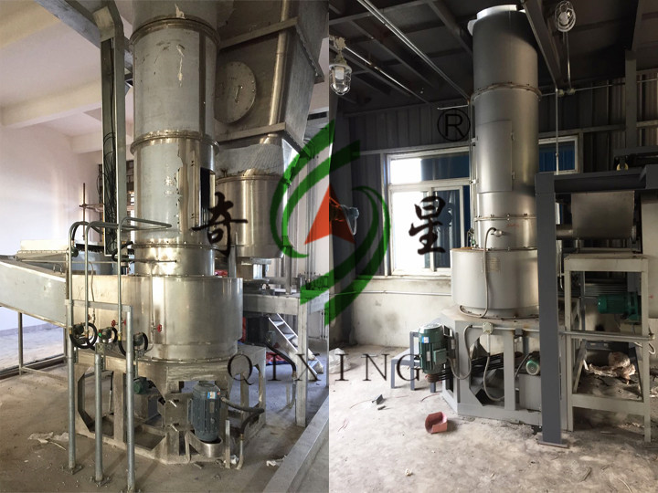 硫酸鈣專用閃蒸干燥機由熱空氣切線進入干燥器底部,在攪拌器帶動下形成強有力的旋轉風場。膏狀物料由螺旋加料器進入干燥器內,在高速旋轉攪拌槳的強烈作用下,物料受撞擊、磨擦及剪切力的作用下得到分散,塊狀物料迅速粉碎,與熱空氣充分接觸、受熱、干燥。物料初水分為30%,終水分達到15%,加熱方式為直燃式燃氣熱風爐。